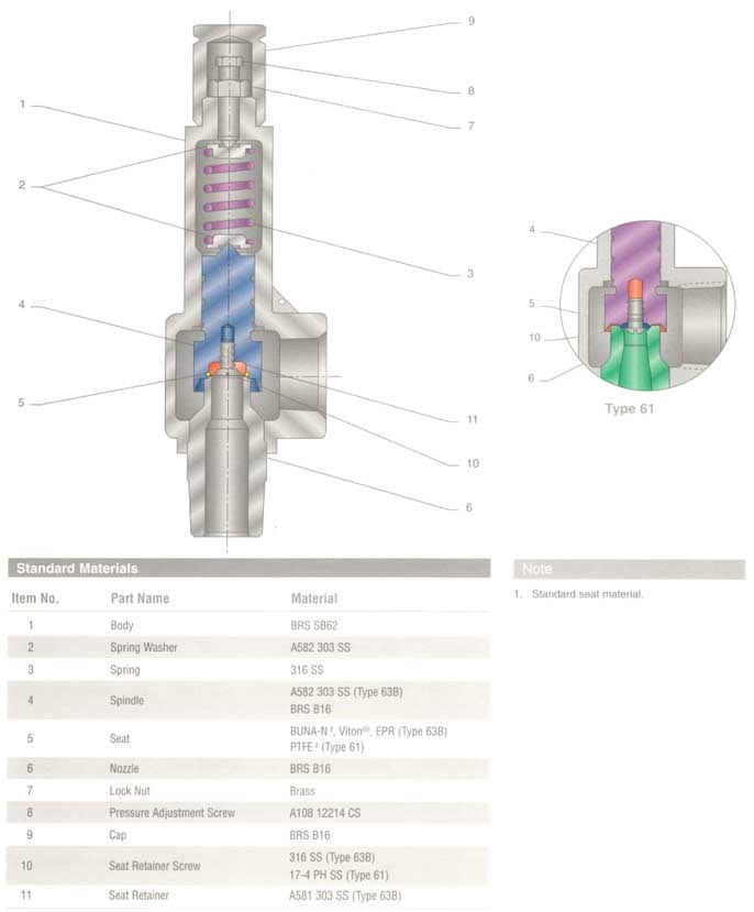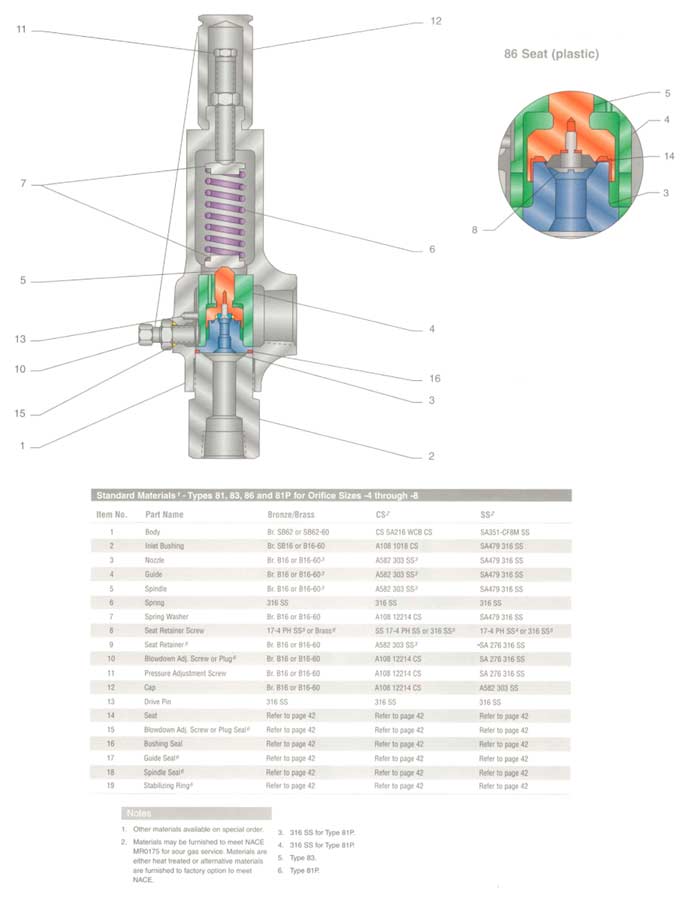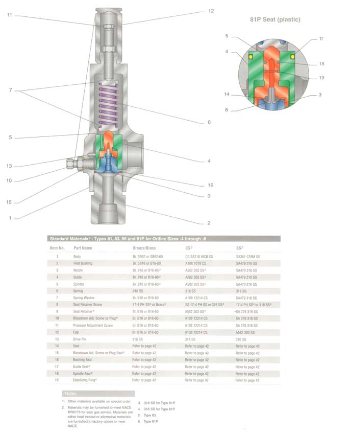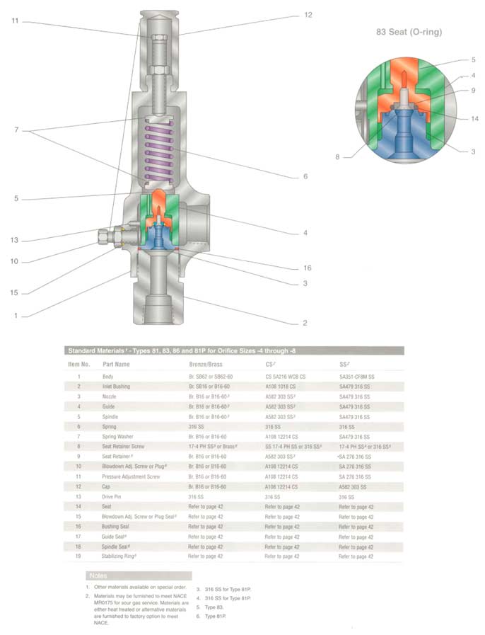 Features: Types 81 and 83 are direct spring operated valves designed with special patented internals and soft seats to provide superior performance. This range is capable of solving the most difficult pressure relief problems with valves suitable for gas vapor, and steam service. Type 81 and 83 valves carry the ASME Section VIII Code Stamp.