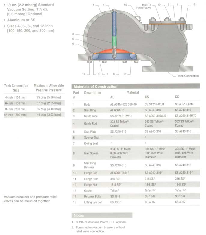 Vacuum Setting1 oz, 2 oz, 3 oz, 4 oz (4.3 mbarg, 8.6 mbarg, 12.9 mbarg, 17.2 mbarg)