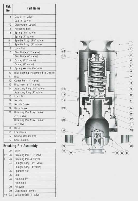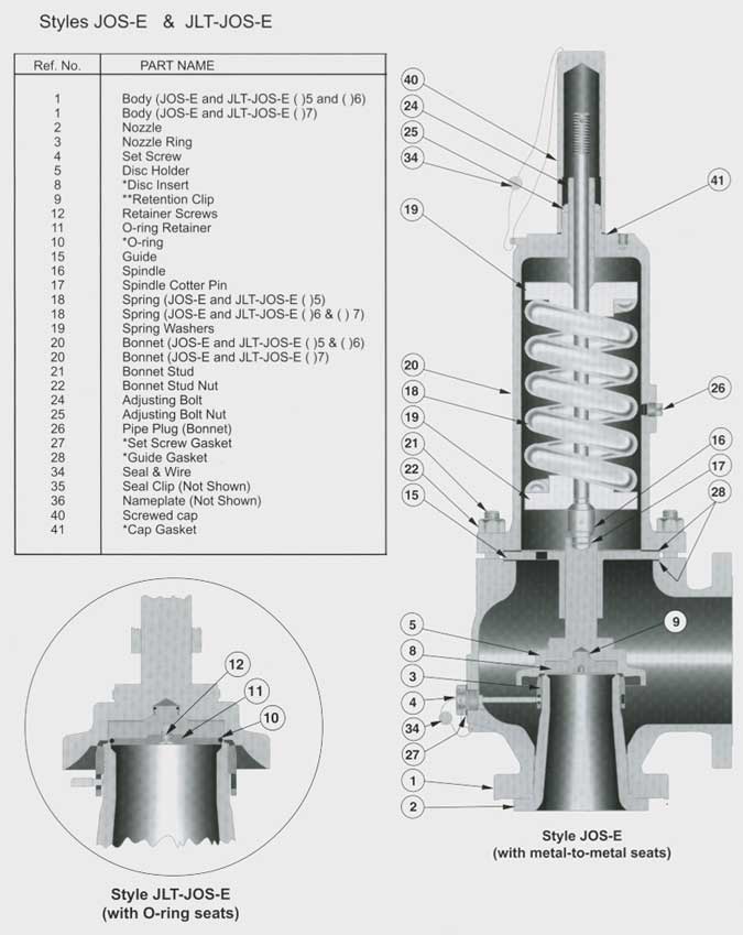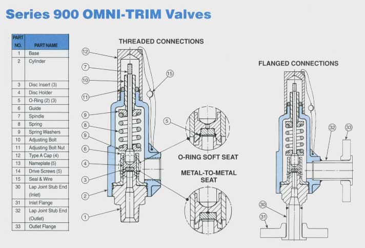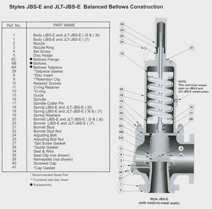 | Materials: | Standard materials are carbon steel cylinder, 316 stainless steel base, disc insert, disc holder, guide, adjusting ring, set screw and gasket with 17-17PH stainless steel spring. Optional materials are available for special applications. |