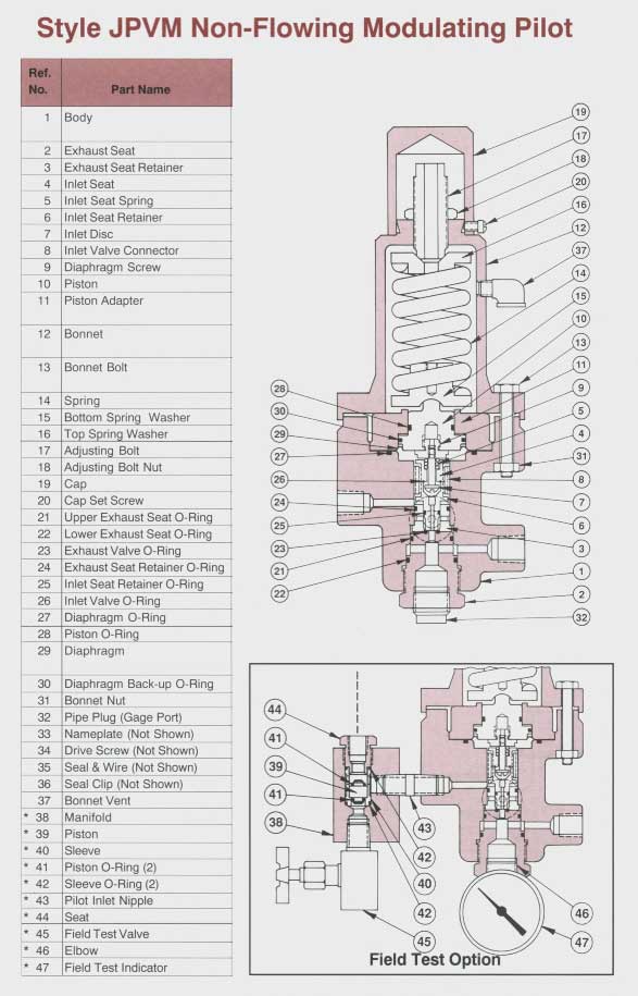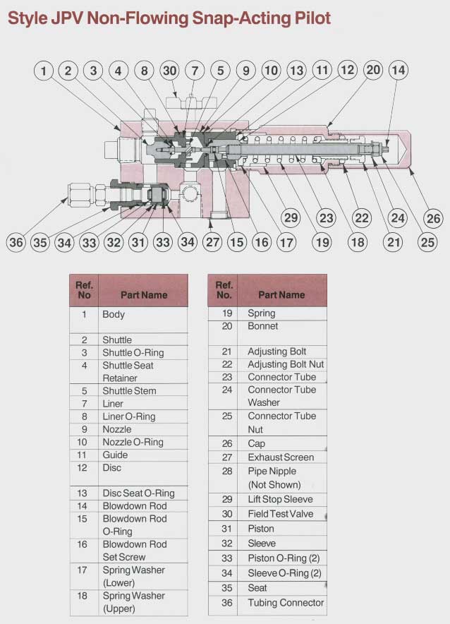 Non-flowing, modulating, pilot operated, pressure relief valve. Used for overpressure protection of gas, vapor, liquid and steam. Mounted on the same main valve used with Style JPV. Ask for Catalog No. 318. Specifications: